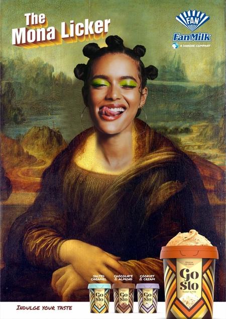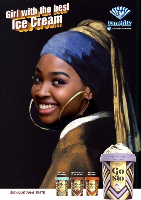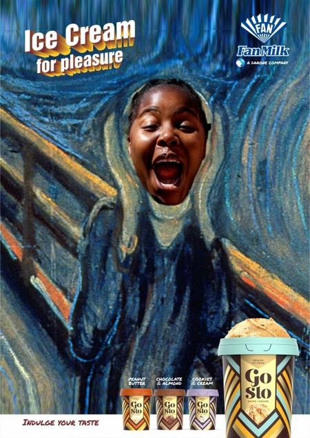 This work won us the GoSlo (Nigeria's first locally produced premium Ice-cream brand under the stable of Fan Milk) Pitch. To play up the premium quality of the brand, we decided to superimpose Nigerians inside famous art pieces like: Girl with the Pearl Necklace, The Scream and The Mona Lisa using copy to play on the names of the pieces.